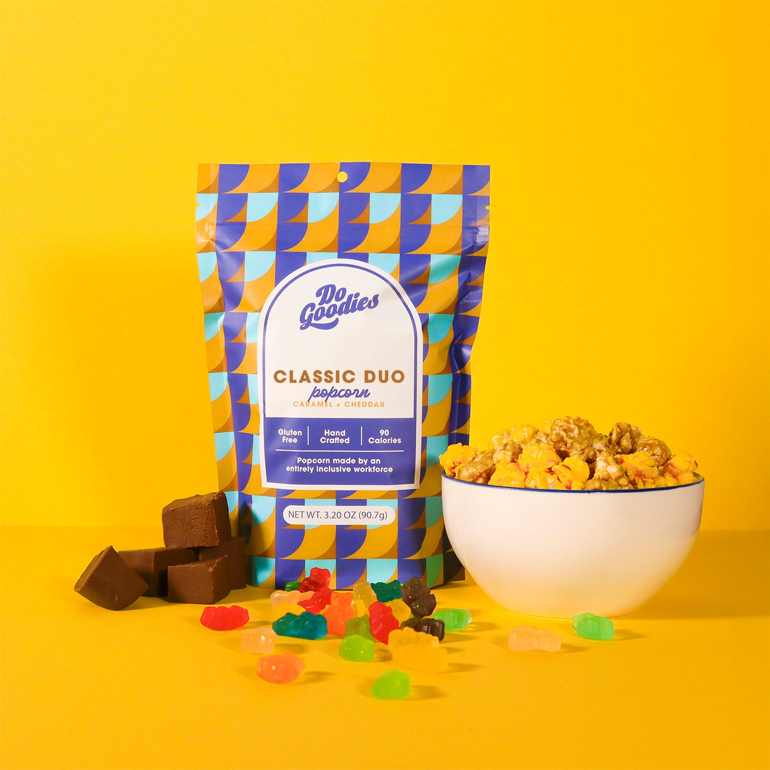 A little bit of everything makes a perfect gift! Classic Duo popcorn, Gummi Bears, and Chocolate fudge—everything the heart—and belly—needs to feel a little fuller.